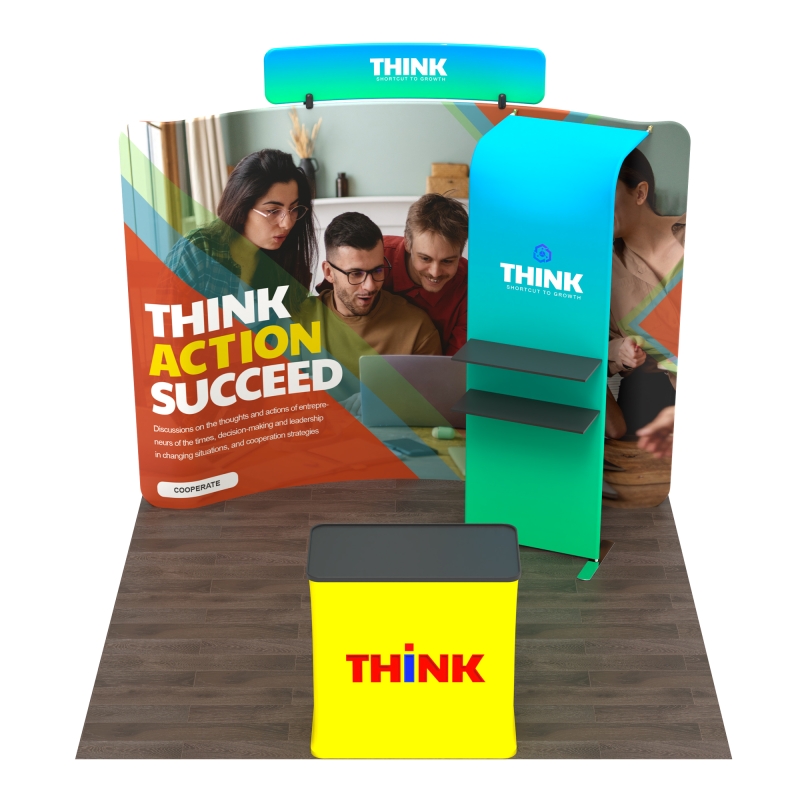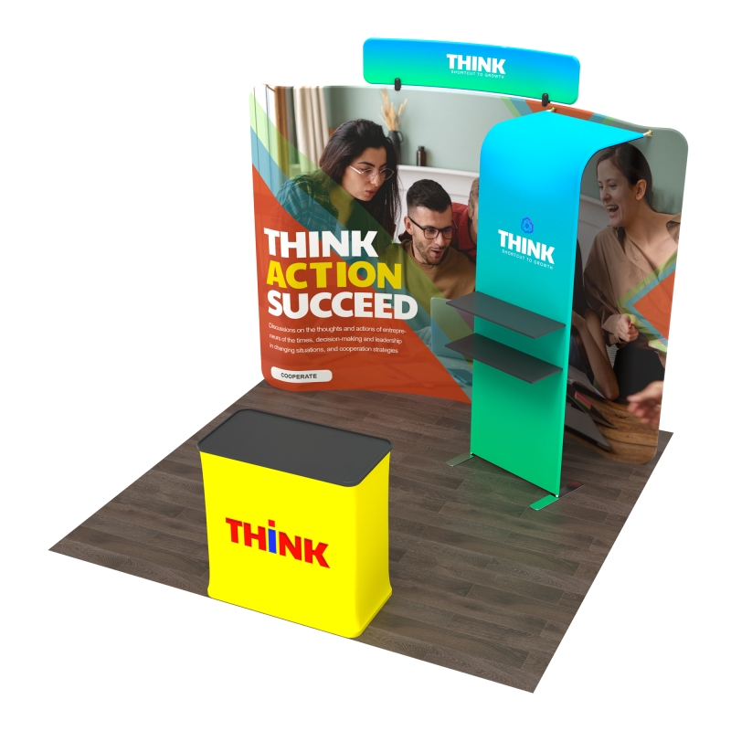 This booth features a durable tension fabric backdrop and a built-in shelving unit with two layers, ideal for showcasing products, brochures, or promotional materials.