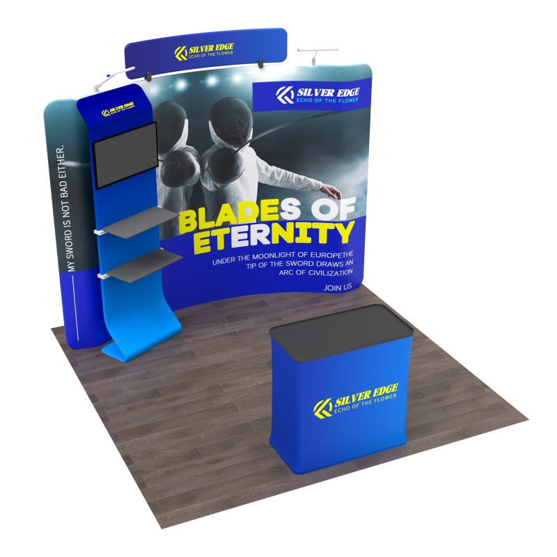 This booth includes a durable tension fabric backdrop, a TV display stand, and two adjustable shelves, ideal for showcasing products and promotional materials.