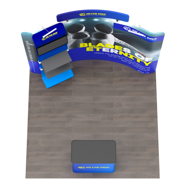 10x10 Curved FlexZip Trade Show Booth with TV Display Stand and Podium offers a modern, eye-catching design, perfect for a variety of events. Featuring a 10ft curved tension fabric backdrop, it ensures maximum visibility and a sleek, professional appearance. The booth includes a TV display stand for presentations and product demos, along with a podium for showcasing promotional materials, brochures, or product samples.