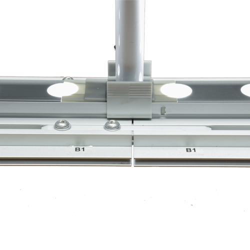 The bottom aluminum rails integrate LED mounting channels and numbered locking joints for effortless setup. Each labeled connection point helps exhibitors assemble the frame quickly and accurately, creating a bright, seamless backlit display every time.