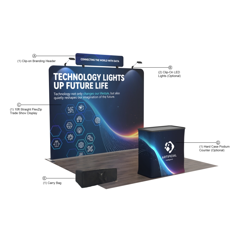 The 10ft Straight FlexZip Trade Show Booth offers a sleek, professional display solution with easy setup. Featuring a straight backdrop with vibrant graphics and a customizable header, this booth ensures maximum visibility for your brand. The podium provides convenient storage for promotional materials like samples and brochures, adding to the booth's functionality. The tool-free setup allows for quick assembly, so you can focus on what matters most: your presentation.