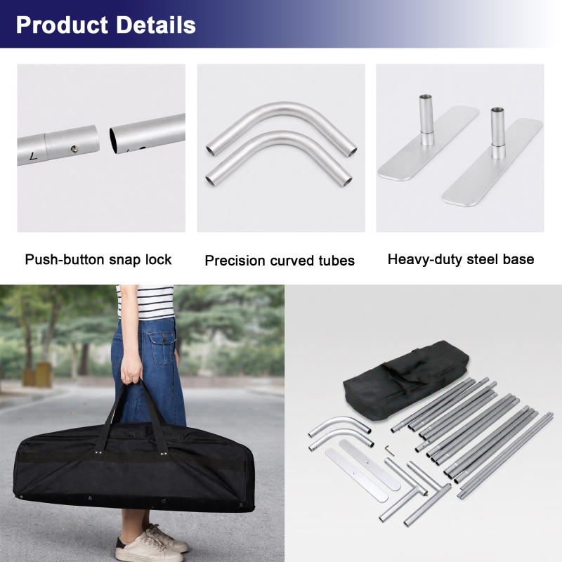 The lightweight aluminum frame uses snap-button connections with clear numbering, making setup fast and intuitive. Strong yet portable, it provides reliable support without the need for tools.