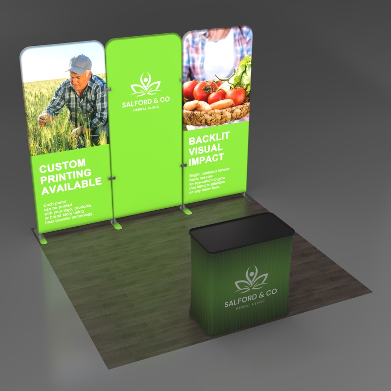 Includes a sleek fabric counter that offers both functional workspace and concealed storage, ideal for greeting visitors or displaying promotional materials.