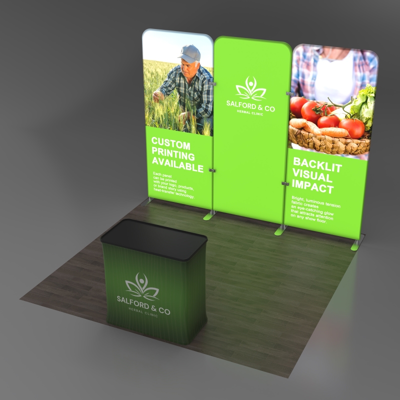 The 10ft display is made up of three backlit panels that connect seamlessly, allowing flexible combinations and easy customization for different trade show layouts.