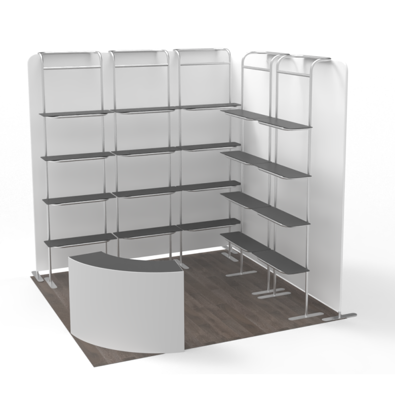 An open-corner layout allows smooth visitor flow while maximizing usable display space along both walls. All graphics, shelf finishes, and overall layout can be customized to align with branding and event requirements. Ideal for trade shows, exhibitions, and product-focused displays.