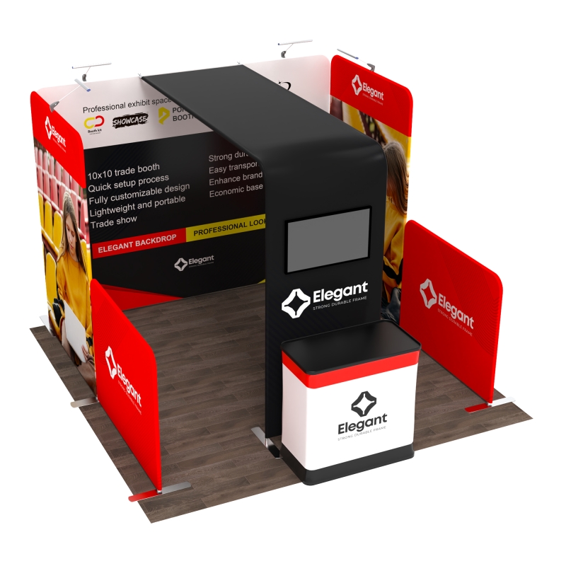 Straight 10ft backdrop combined with an L-shaped side display creates a bold, layered presentation that stands out on the show floor.
