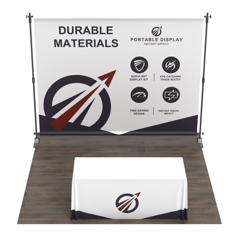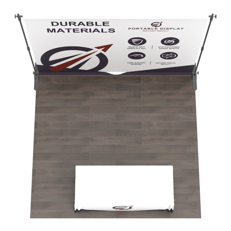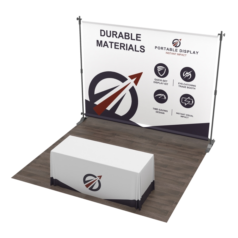 Make your exhibit space stand out with the 10x10 Modular Trade Show Booth 10.2, featuring a 10ft x 8ft step and repeat backdrop and a full print 8ft table throw. This modern combination creates a unified and professional brand presentation, perfect for trade shows, corporate events, conferences, and product launches. The large 10ft backdrop delivers high-impact visibility for your logo and messaging, while the seamless table throw adds depth and style to your display area.
