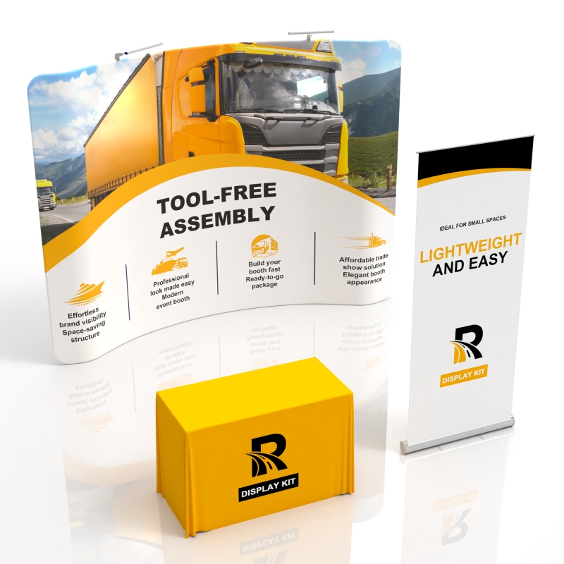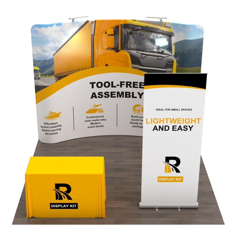 The 10ft curved wall delivers a modern, eye-catching shape that enhances booth depth and brand visibility at events.