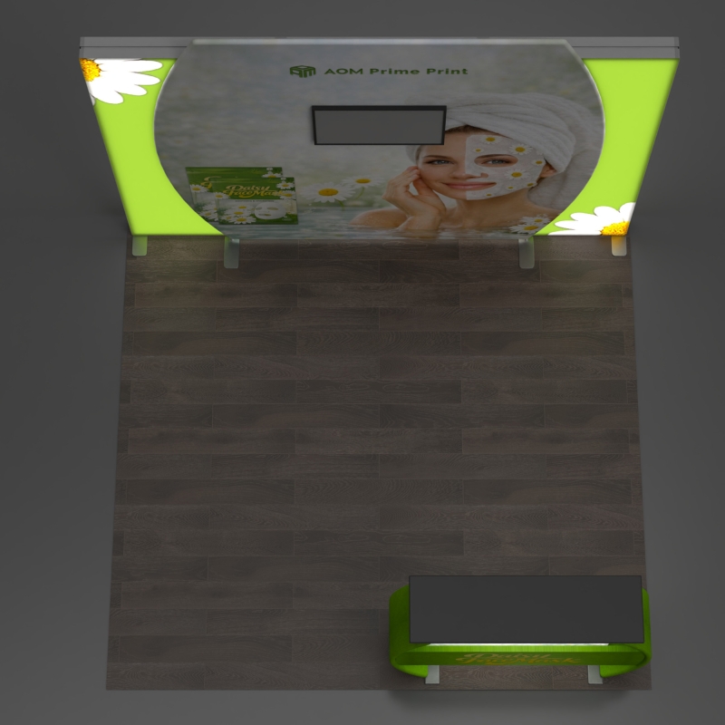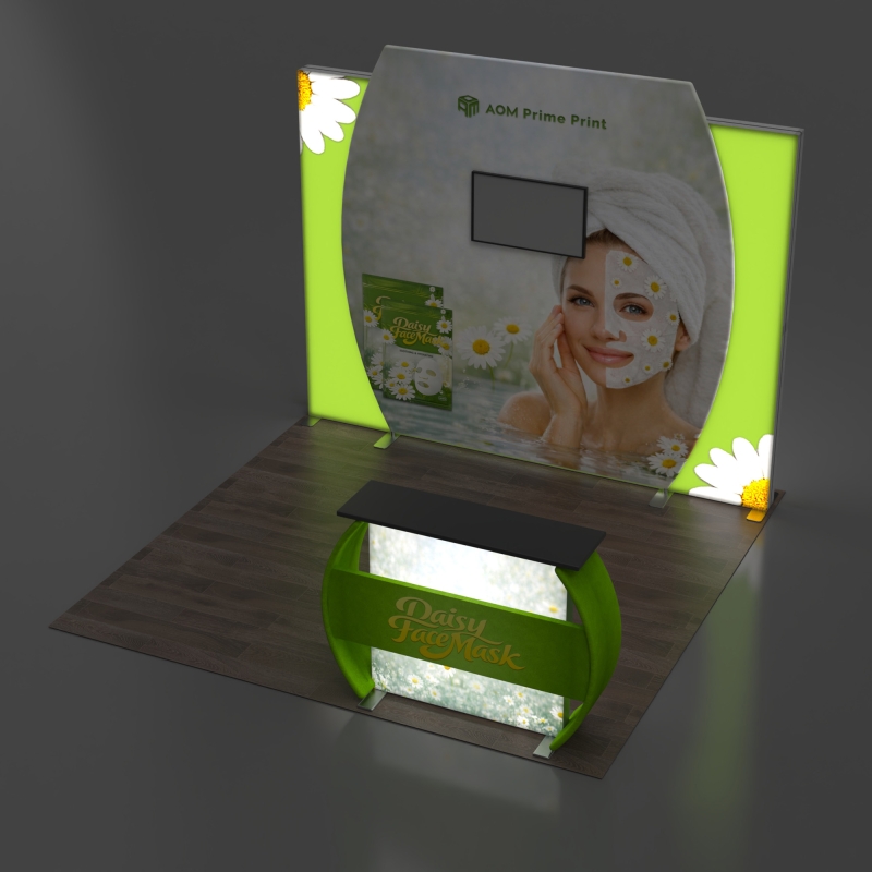 The center display wall supports a large monitor installation to showcase video content, brand messaging, or product demonstrations for stronger visual engagement. Positioned at the front, a uniquely shaped illuminated reception counter adds another bright focal point while creating a natural interaction area for visitors. This modular display system delivers a high-impact visual experience that enhances booth visibility while remaining portable and adaptable for repeated use across multiple events.