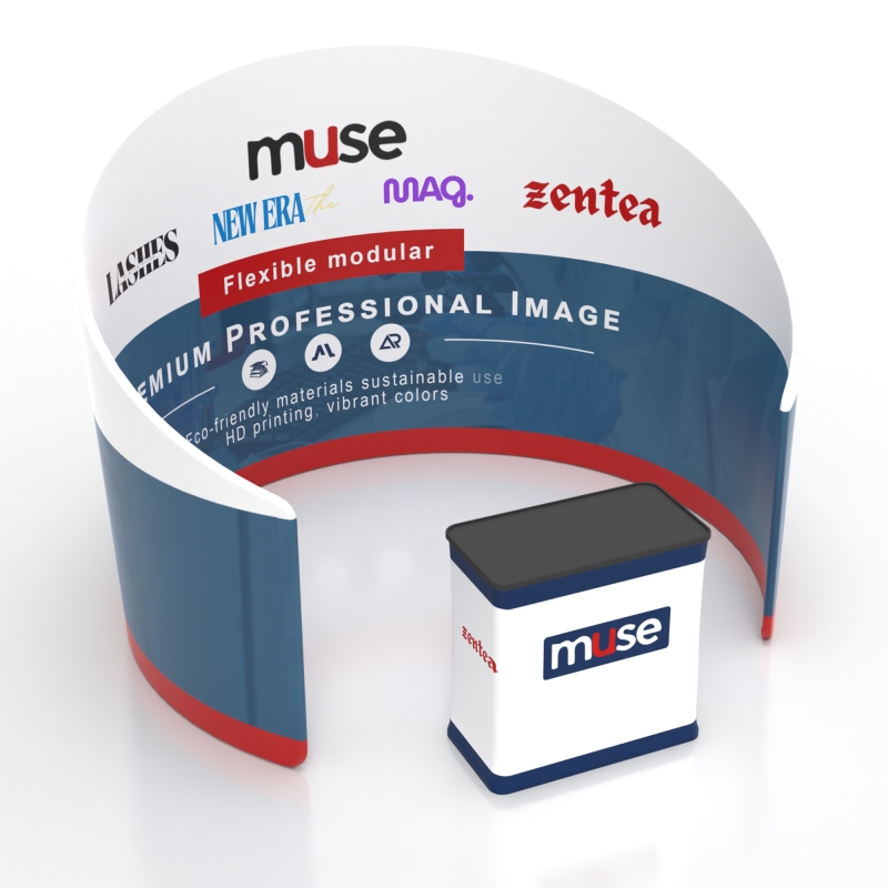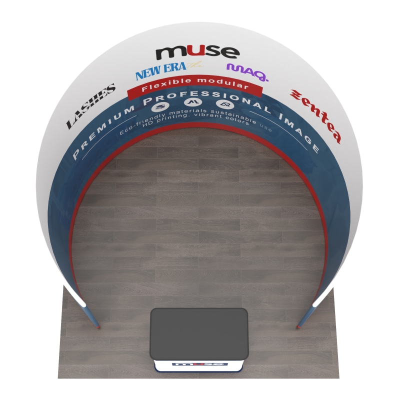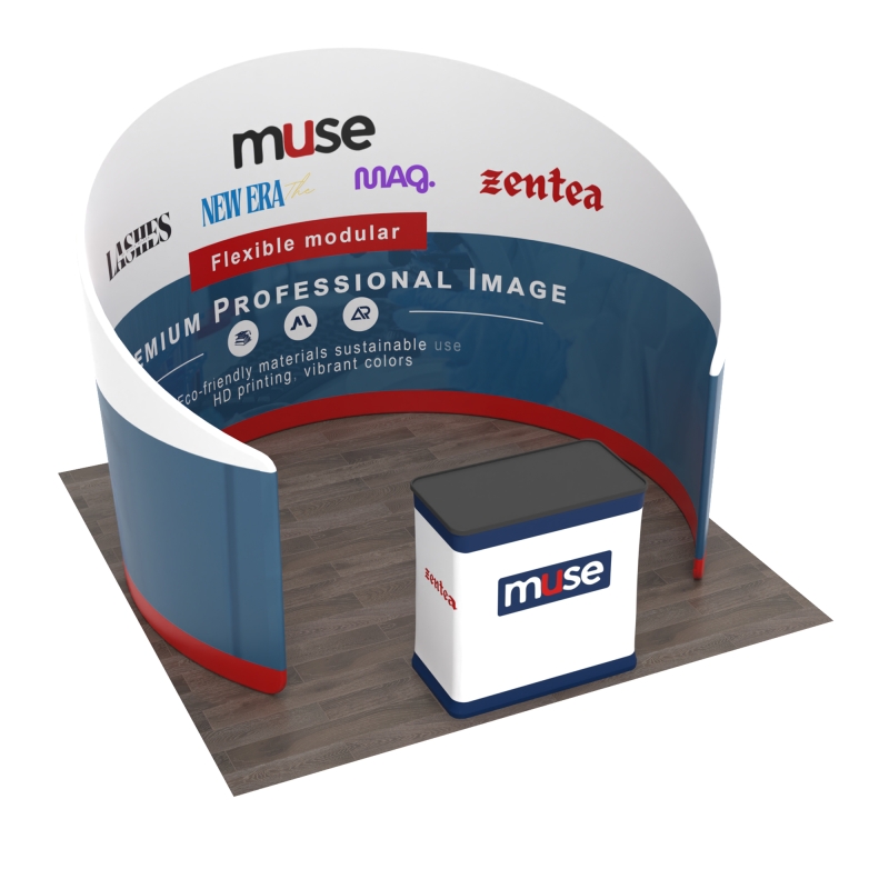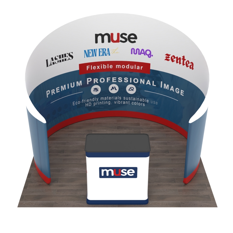 The curved, semi-enclosed backdrop features a seamless full-color tension fabric graphic that defines your 10x10ft booth with a premium, professional look. The C-shaped layout creates a focused presentation area while keeping an open, inviting entrance, perfect for brand showcases, networking lounges, or demo zones.