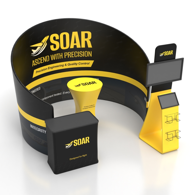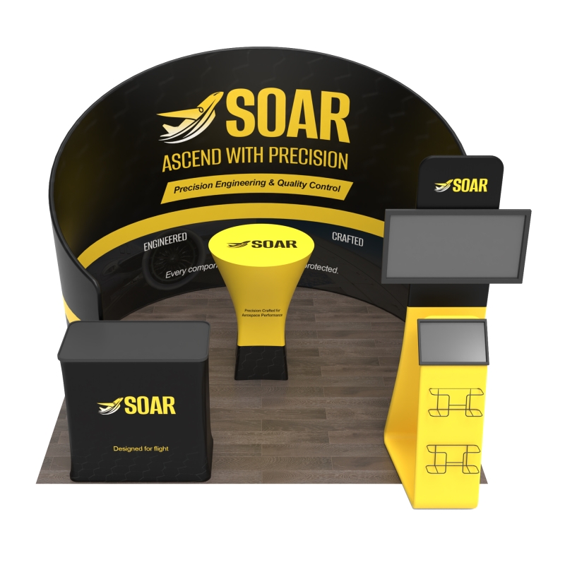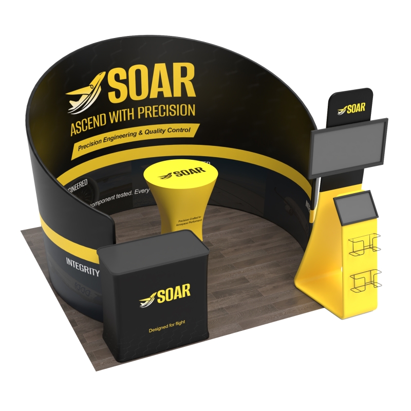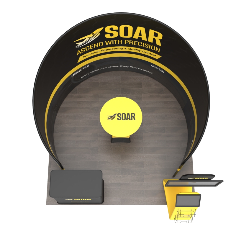 The curved semi-circle backdrop creates an immersive, semi-enclosed presentation area that surrounds visitors with your branding while maintaining an open, welcoming layout.