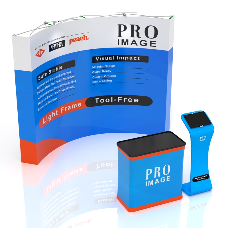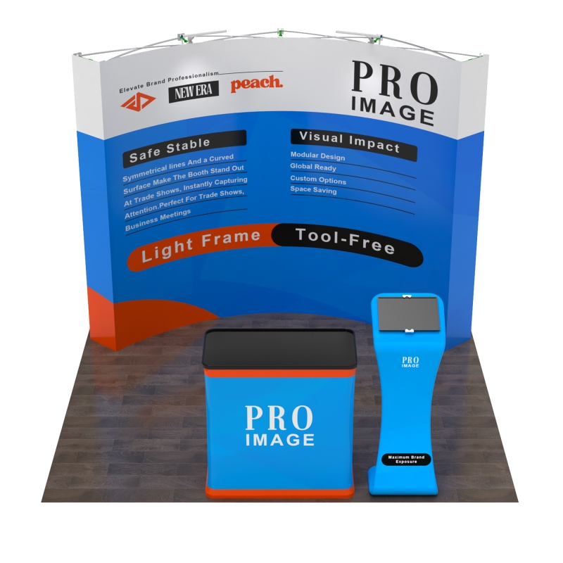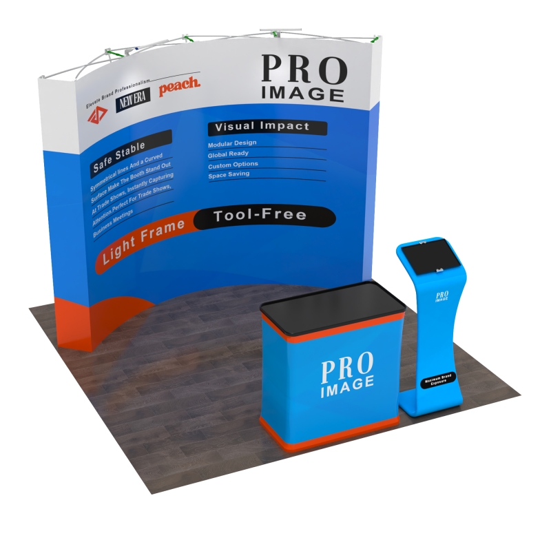 Eye-catching curved frame design with wrinkle-free tension fabric graphics ensures your booth looks bold and professional.