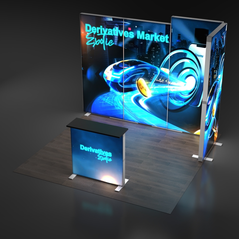 The 10x10 SEG Folding Lightbox Booth 10.4 combines mixed-size backlit panels to create a dimensional, visually dynamic display wall that stands out on busy trade show floors. With two 3.3ft x 7.4ft and two 3.3ft x 7.9ft folding SEG lightboxes, this layout delivers height variation and balanced illumination that draws attention from multiple angles. The included 3.3ft x 3.3ft SEG lightbox counter adds a functional branded surface for demos, product display and attendee interaction, keeping your visual identity consistent across the booth.