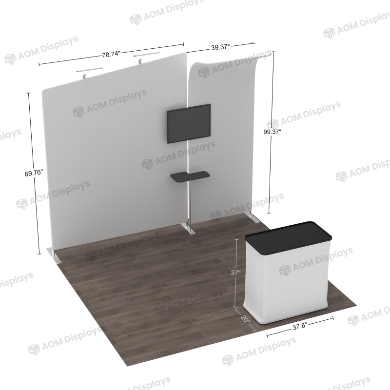 This booth combines style with functionality. The integrated TV mount and display shelving allow you to showcase videos, product demos, or promotional materials, while the lightweight aluminum snap-tube frame ensures a fast, tool-free setup. All components pack neatly into the included carry bag, or you can upgrade to the hard case podium that doubles as a branded counter, adding both storage and presentation space for a complete professional display.