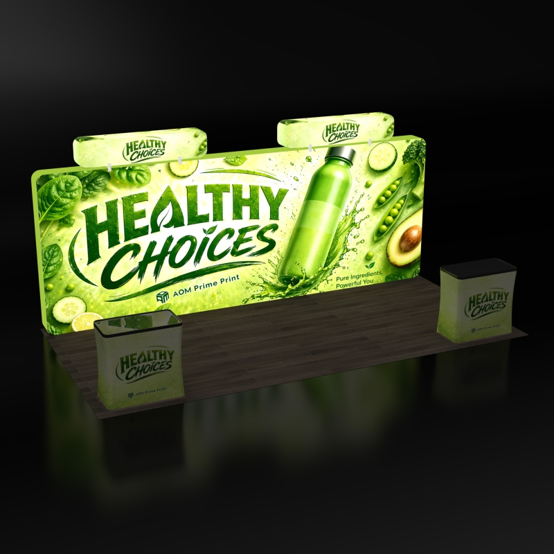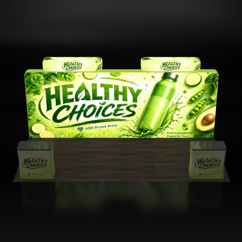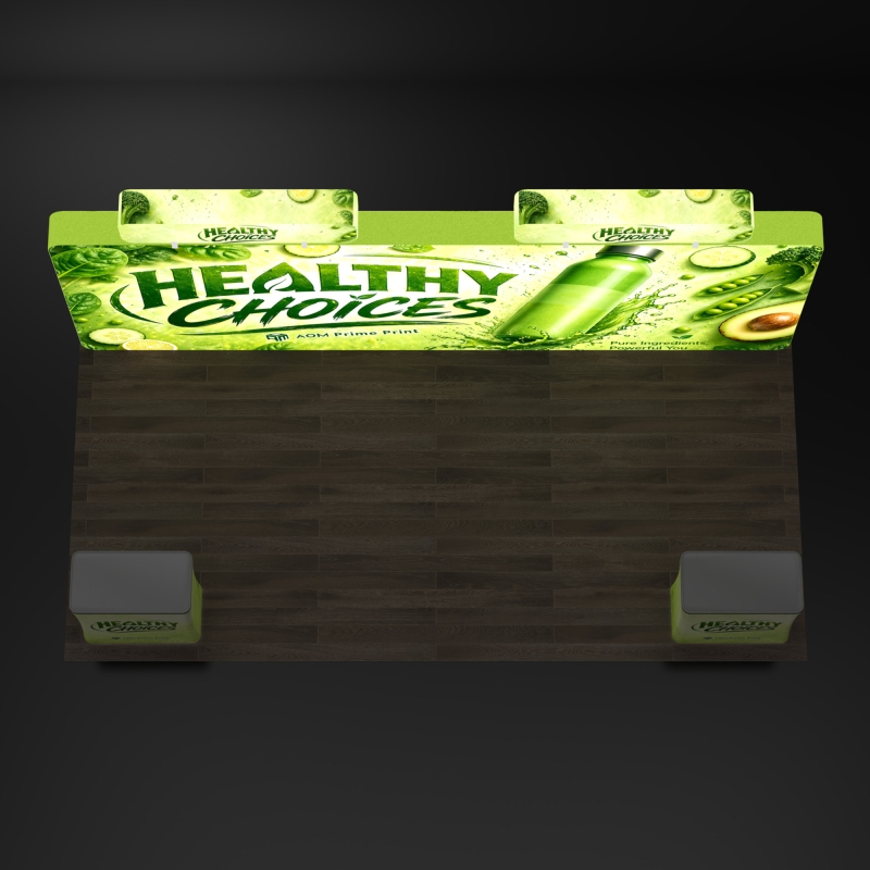 The integrated 3D backlit header delivers bright, even illumination that highlights your logo above the booth structure, increasing visibility and helping your branding stand out clearly across the show floor.