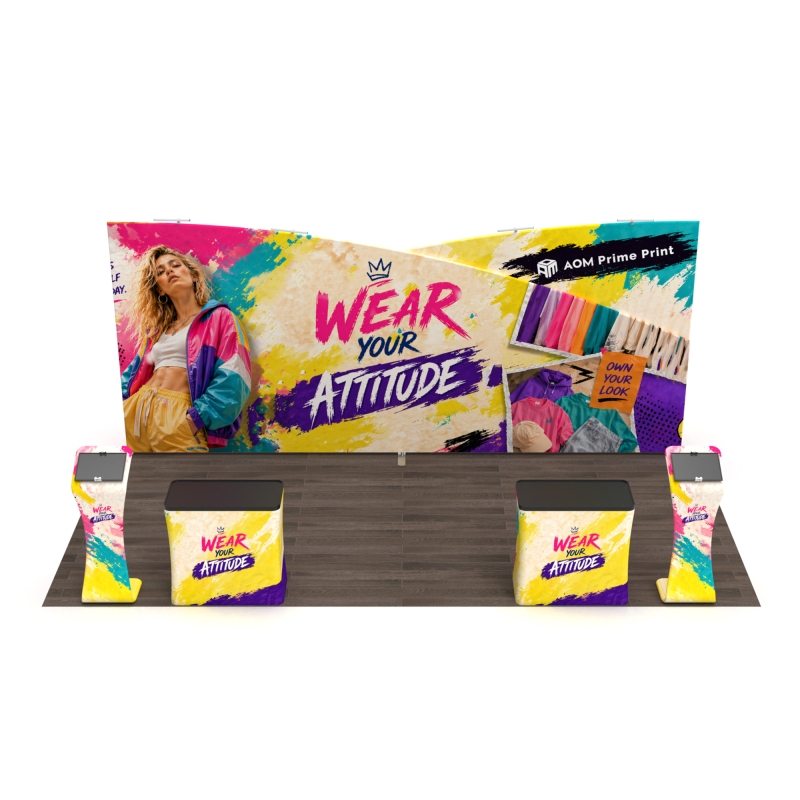 Built with a lightweight modular aluminum frame and tension fabric graphics, the display supports tool-free assembly and efficient transport between events. The flexible structure makes it suitable for exhibitions, retail activations, showroom presentations, and promotional display environments requiring a clean and organized branding setup.