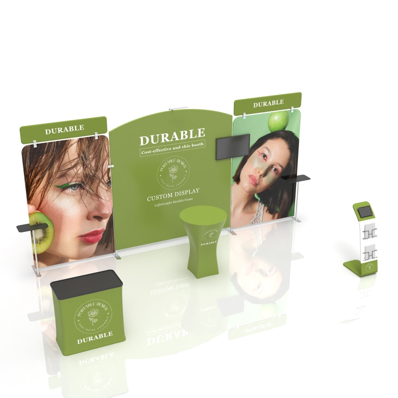 Comes with podium counter, cocktail table, and iPad literature stand for a cohesive and functional trade show setup.