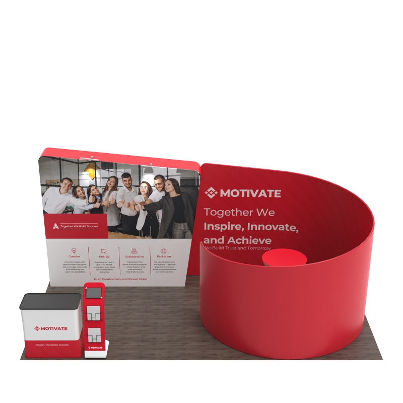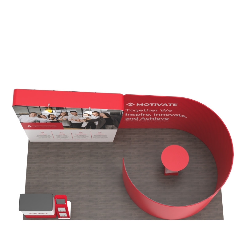 This complete modular booth package includes everything you need for a successful presentation, a portable hard case podium counter, a stretch fabric cocktail table, and an iPad literature banner stand. Built with lightweight aluminum frames and durable tension fabric graphics, this display is easy to assemble, transport, and reconfigure for different events. Whether you're launching a new product or elevating your brand presence, this portable 10x20 trade show display delivers style, versatility, and impact.
