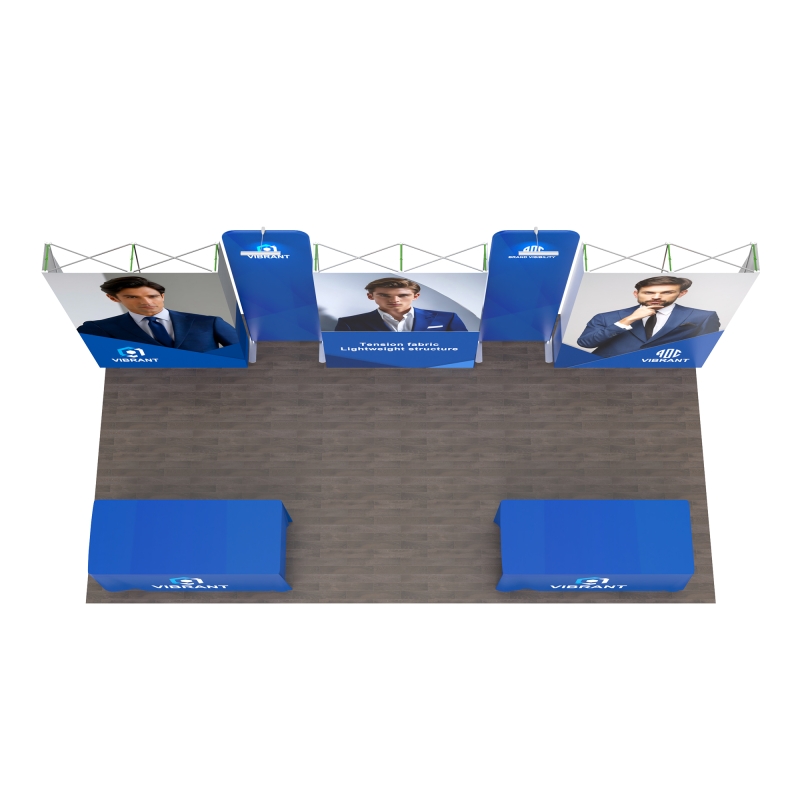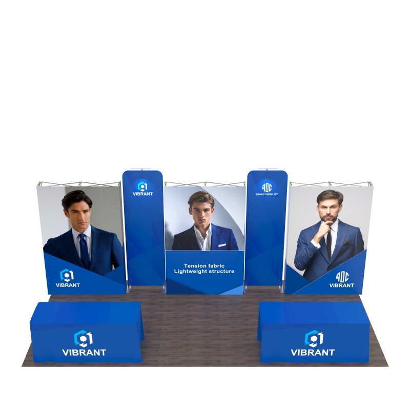 Three 5ft pop up displays create a bold visual centerpiece for your 20ft booth. Lightweight frames with vibrant tension fabric graphics ensure lasting brand visibility.