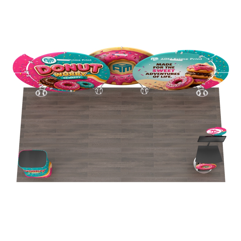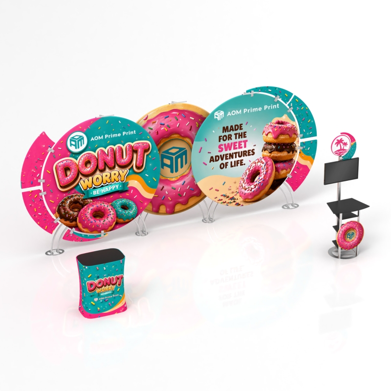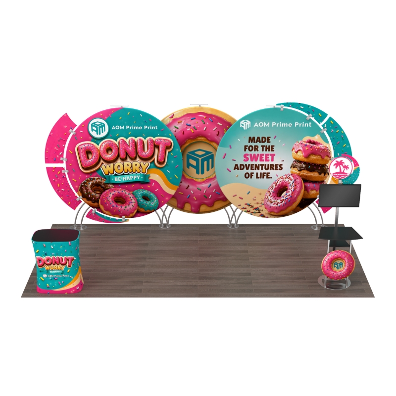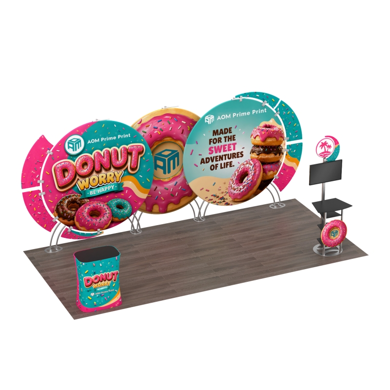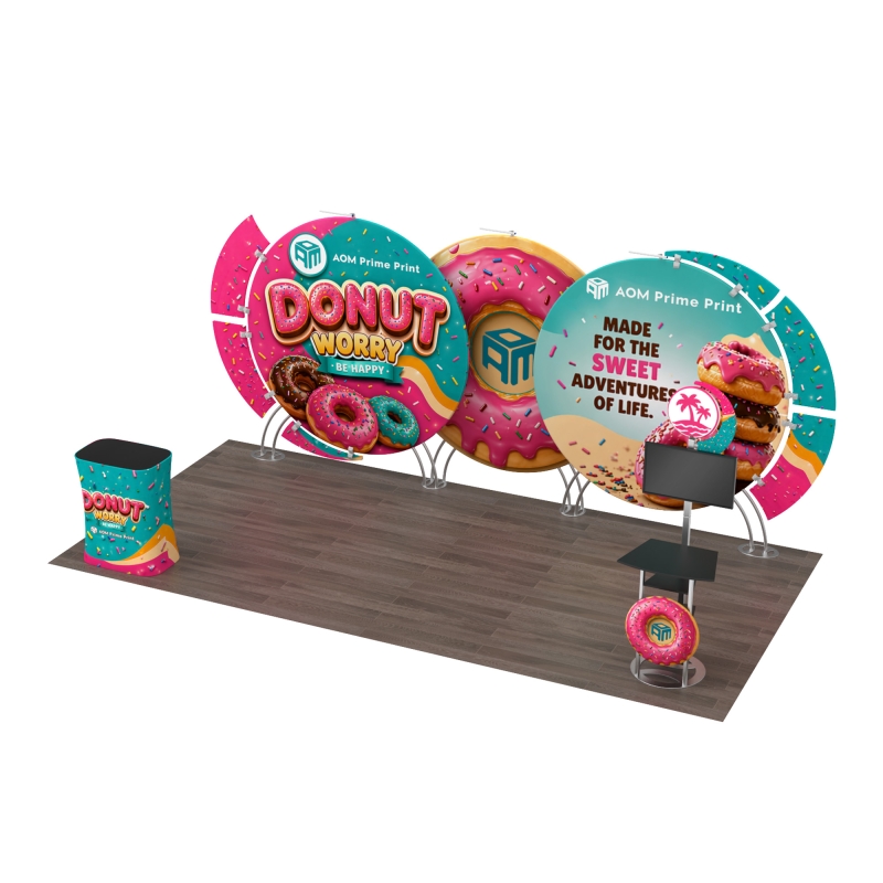 Three circular tension fabric panels can be arranged symmetrically, staggered, or used individually for flexible booth configurations.