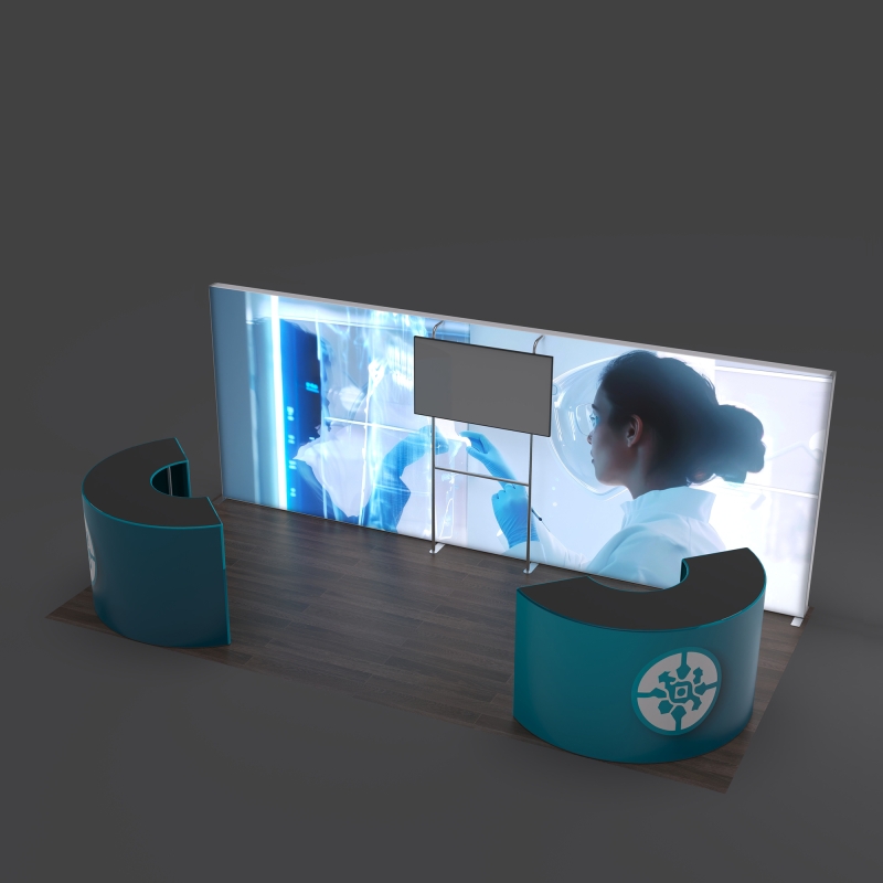 The booth features a full-width 20ft Ă— 7.5ft illuminated SEG lightbox backdrop, delivering bright, even LED illumination across a seamless fabric graphic. Silicone Edge Graphics (SEG) ensure a perfectly taut, wrinkle-free display with edge-to-edge visuals that elevate brand presence and attract attention from across the show floor.