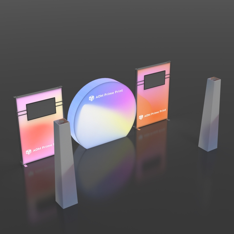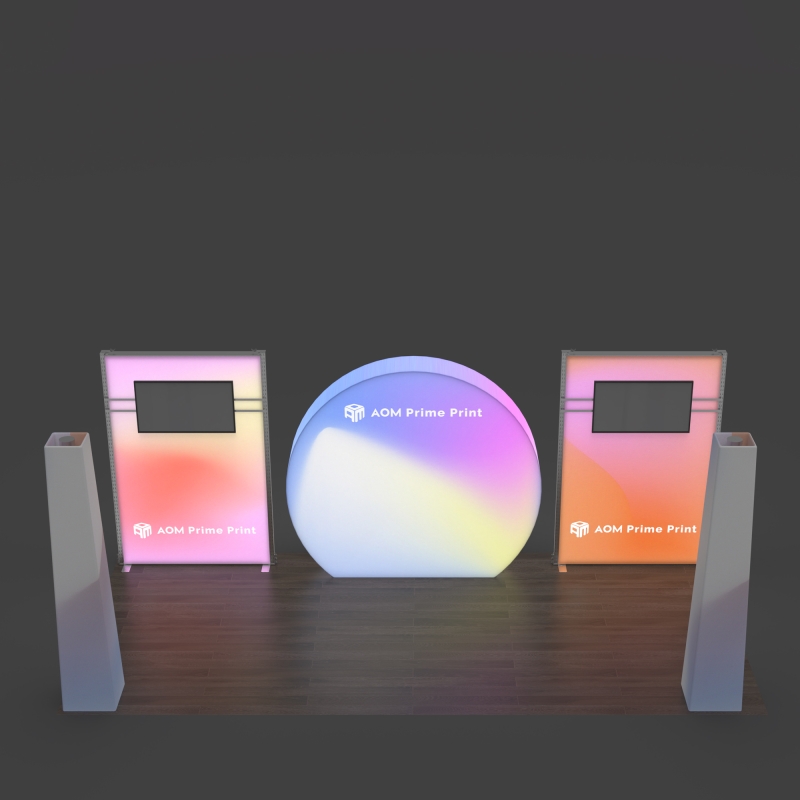 The centerpiece of this booth is a half-round 3D backlit SEG wall, forming a curved illuminated backdrop that creates depth and draws attention from multiple viewing angles. The smooth arc design enhances booth flow while delivering bright, even LED illumination across seamless silicone edge fabric graphics for a polished, high-end presentation.