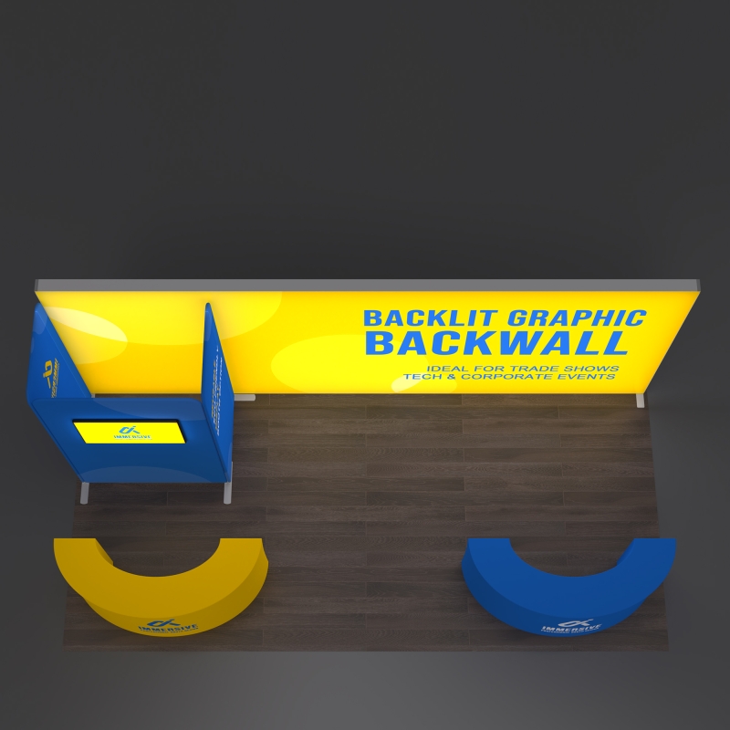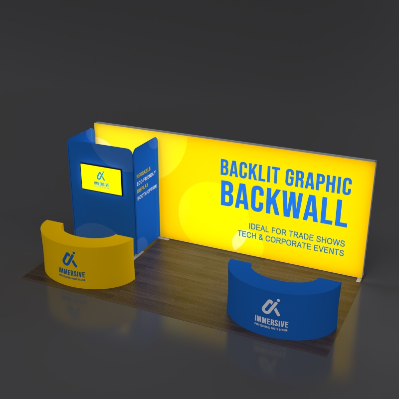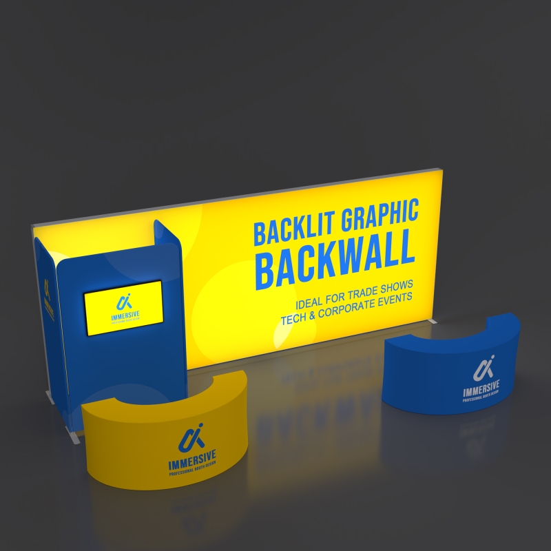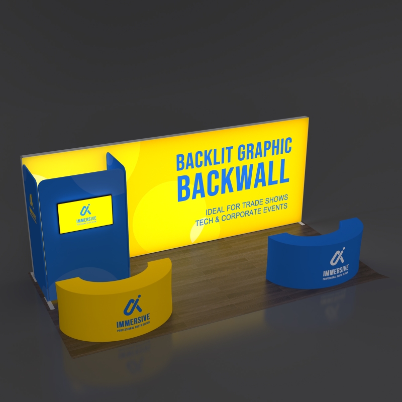 Command the spotlight with this all-inclusive exhibition suite, designed to forge powerful connections. Its centerpiece is a brilliant 20' backlit display that glows with vibrant content, serving as your primary visual anchor. This is complemented by a versatile three-panel magnetic backwall system—reconfigurable to extend your brand narrative or create a private space. The package is completed with two stylish semi-circular display counters, ensuring a professional and welcoming brand presence, along with a versatile monitor mount engineered to seamlessly integrate TV mount for dynamic, high-impact multimedia presentations.