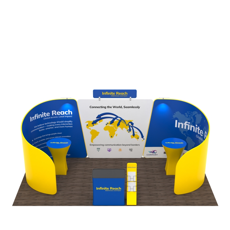 Create an unforgettable brand experience and elevate your promotions with the 10x20 Trade Show Booth. The complete kit includes two C-shaped backwalls and a trapezoid straight backwall for dimensional impact, along with a header board for top-level visibility. A cocktail table and brochure rack are also included to facilitate engagement and keep marketing materials organized. Fully customizable with your logos and graphics, this booth ensures a professional and immersive presence that captures attention and maximizes exposure.