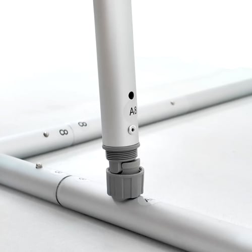 The frame tubes align using the printed labels, and the bottom ring locks in place with a quick twist. This creates a secure, tool-free connection that’s fast and easy to set up.