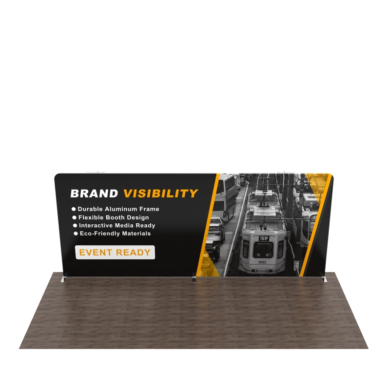 The 18.5ft Flat FlexZip Trade Show Display showcases a sleek, straight frame with crisp lines, creating a smooth and professional backdrop that perfectly highlights your brand's message.
