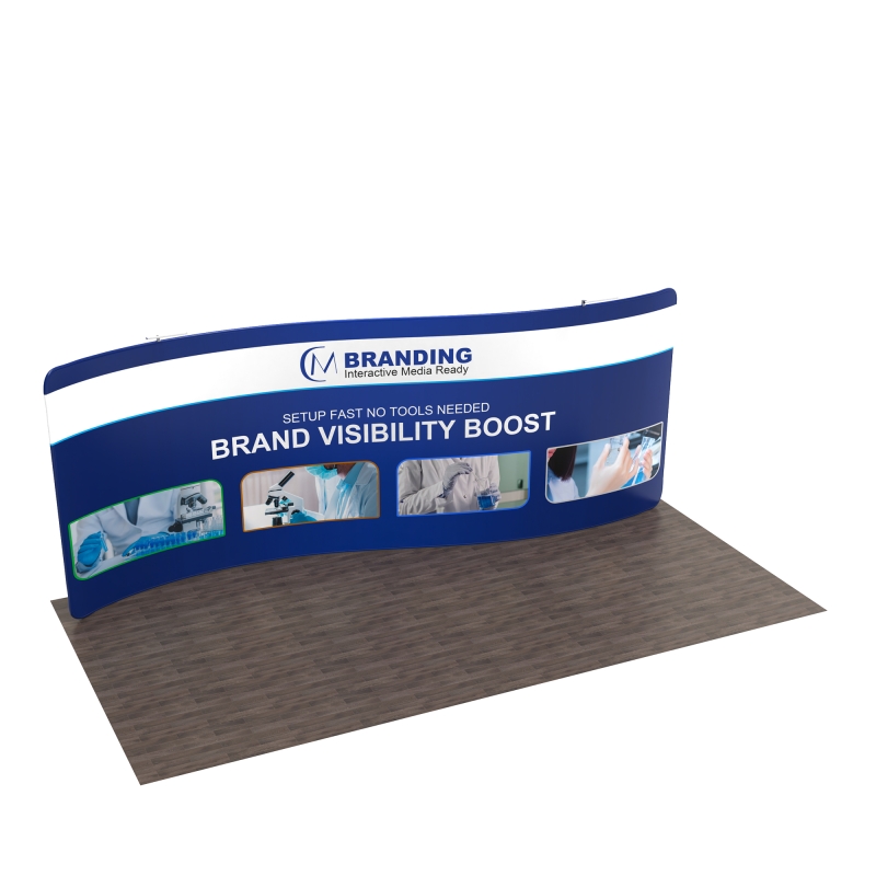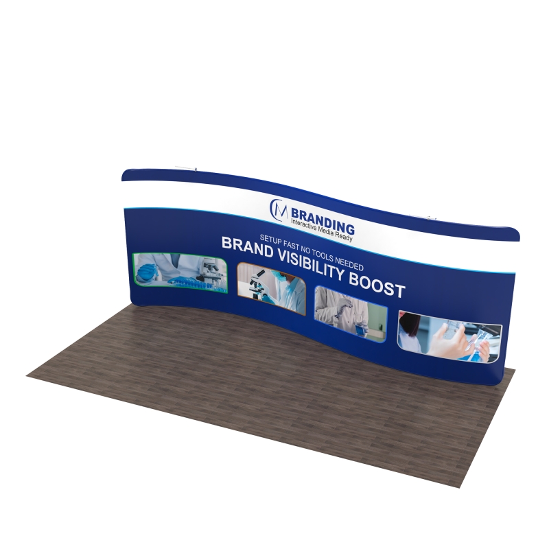 The 20ft S-Shaped FlexZip Trade Show Display features a dynamic, curved design that creates an eye-catching backdrop, drawing attention and highlighting your brand messaging.
