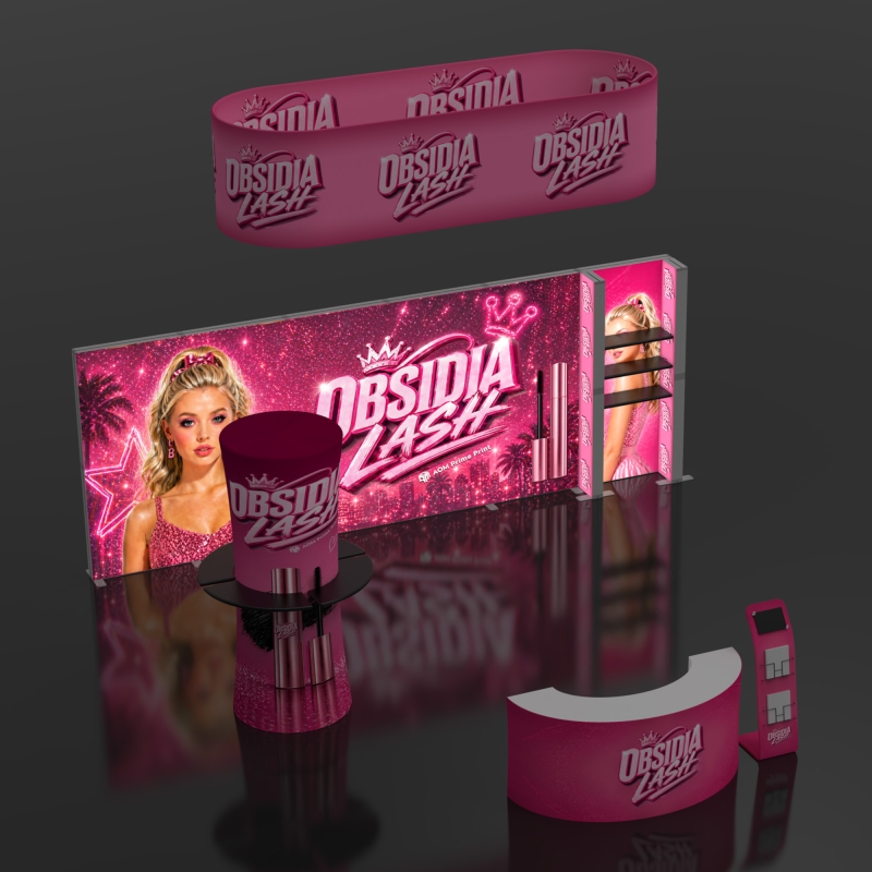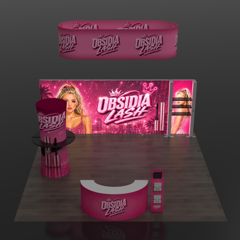 Create a strong and flexible brand presence with this 20×20 modular trade show booth display designed for island exhibits that require visibility from every direction. The layout combines SEG backlit lightbox walls, an overhead elliptical hanging banner, product display shelving, and a reception counter to form a complete exhibition environment that attracts attention and supports visitor engagement. Bright illuminated graphics enhance brand messaging across the show floor, while the suspended hanging banner increases long-distance recognition in large convention halls and busy trade show spaces.