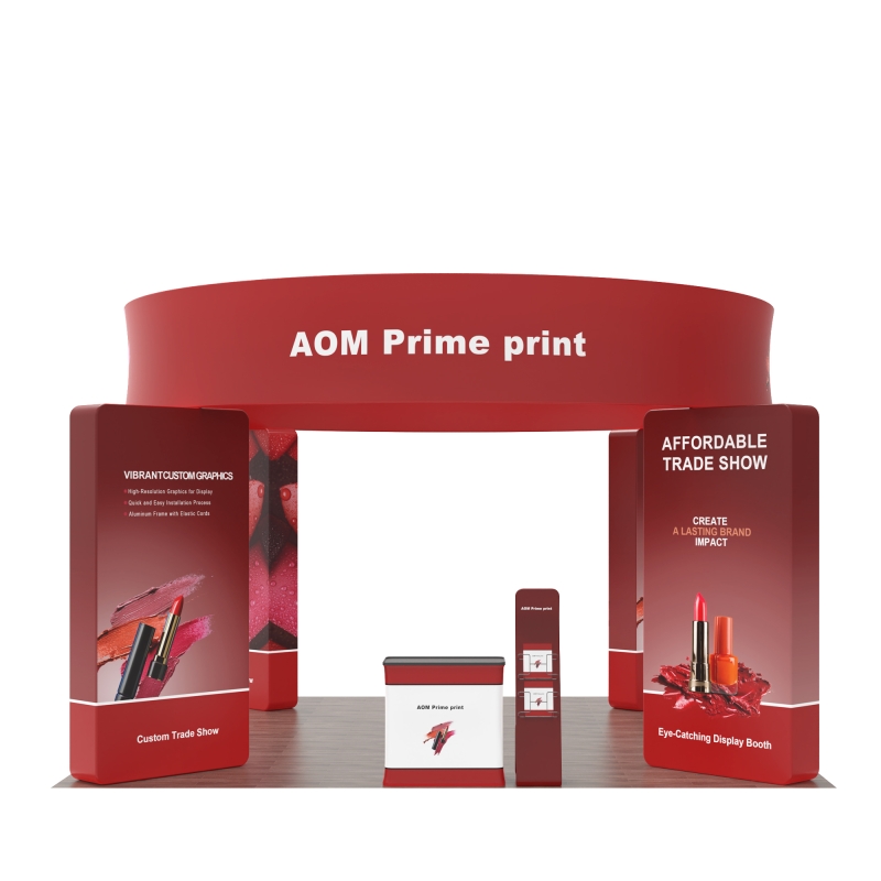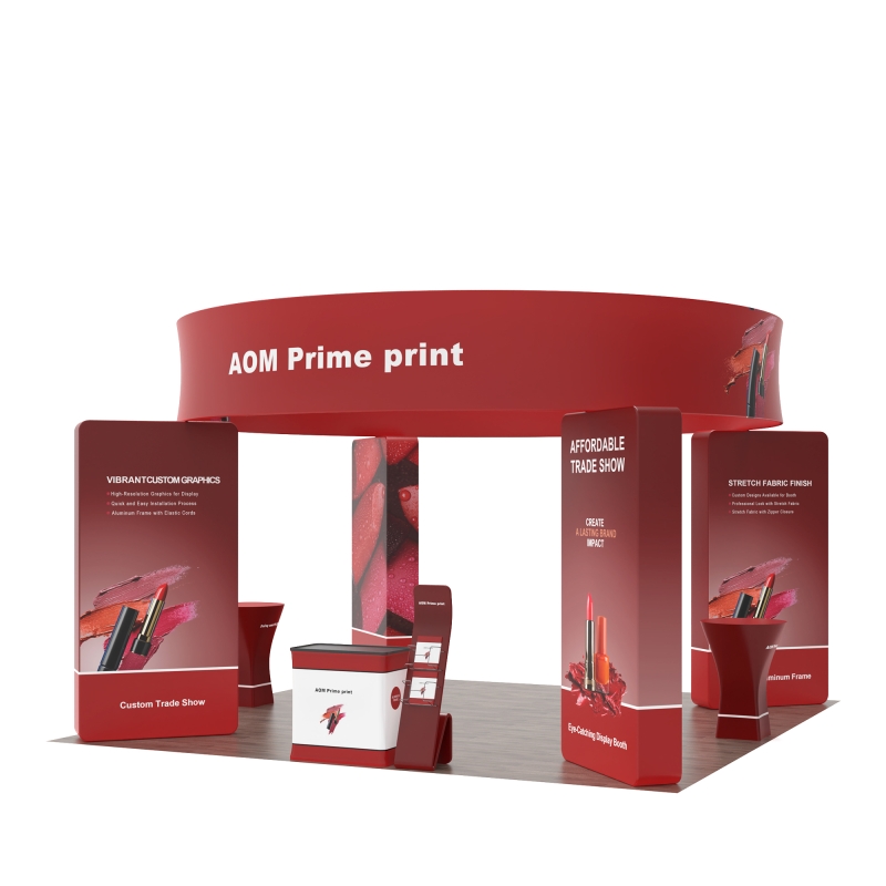 Custom printed fabric graphics allow you to present consistent brand visuals across the hanging sign and display columns for a unified exhibit appearance.