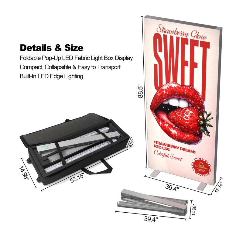 This folding lightbox features built-in LED edge lighting installed along the left and right inner frame, ensuring bright and even illumination across the entire fabric surface. The side-mounted LED strips are engineered to reduce hotspots while enhancing color vibrancy and graphic clarity. Paired with a high-quality tension SEG fabric graphic, the display delivers a smooth, vivid backlit presentation that attracts attention from every angle and elevates your brand presence in any professional setting.