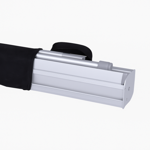 The entire retractable banner stand fits into the included carry bag. The aluminum base, support poles, and printed graphic all pack safely inside. The lightweight case protects the display and makes transport and setup easy.